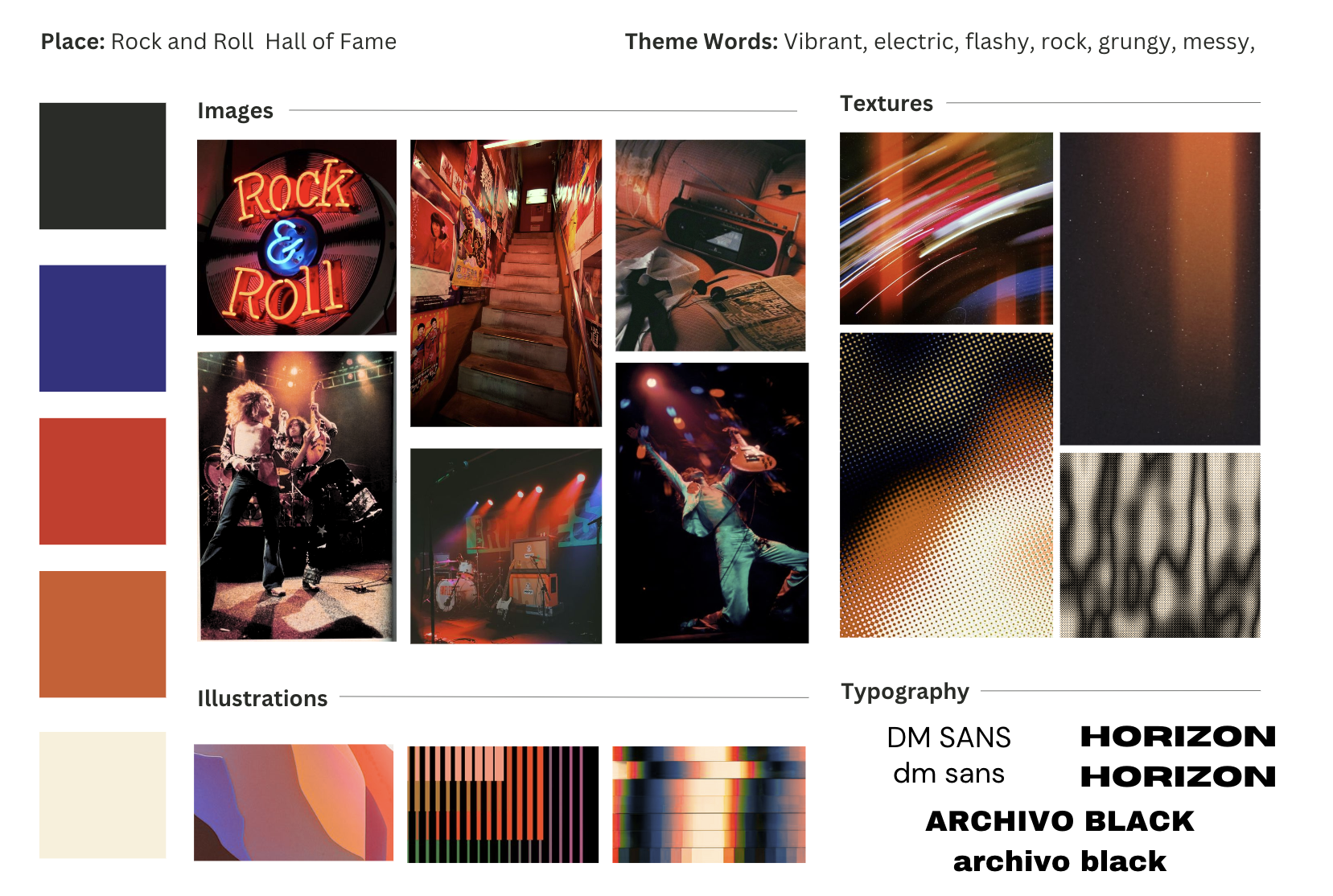 I wanted the visual language to stay true to the Rock & Roll aesthetic, using dark, textural imagery paired with vibrant, concert-like lighting. The contrast creates an energetic, atmospheric look that reflects the tone of the museum experience.